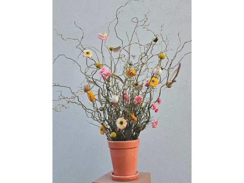 Een mooie geglazuurde stenen pot opgemaakt met Wilgentakken, Zijdebloemen en Paas decoratie.